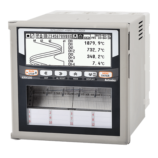 Los graficadores híbridos serie KRN100 pueden medir y registrar diversos datos industriales, como temperatura, nivel, presión y más. Los valores medidos pueden mostrarse en la pantalla LCD o imprimirse en gráficos de tiras. Los datos de medición se pueden almacenar en la memoria USB y se pueden imprimir más tarde utilizando la función de registro de datos (data logger). La configuración remota de parámetros es posible a través de la conexión USB. Los graficadores admiten hasta 12 canales de entrada con tarjetas de entrada de tipo ranura.