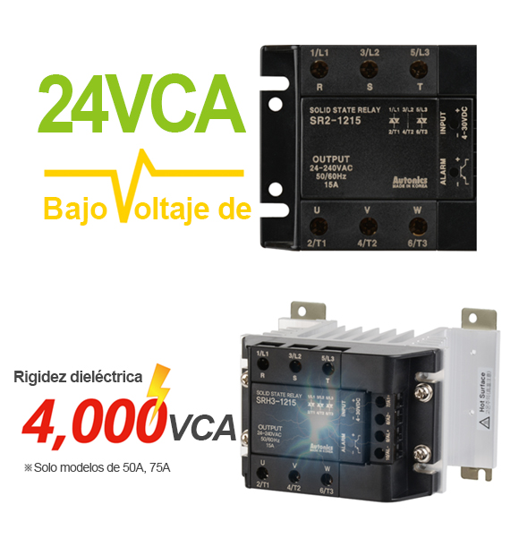 Los relevadores de estado sólido trifásicos serie SR2/3 están disponibles en disipadores de calor desmontables (SR2 / 3) y disipadores de calor integrados (SRH2 / 3). Los relés de estado sólido pueden controlar cargas de 2 o 3 fases y cuentan con dos tipos de orificios de montaje para compatibilidad con varios tipos de disipadores de calor. La serie también cuenta con salida de alarma para un funcionamiento seguro, y también están disponibles en modelos de bajo voltaje de 24 VCA. Algunos modelos cuentan con una alta resistencia dieléctrica de hasta 4000 VCA y los modelos con disipador de calor integrado permiten montaje en riel DIN y paneles.