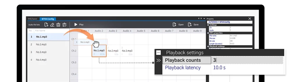 El software DAQMaster permite a los usuarios arrastrar y soltar fácilmente para configurar los archivos de sonido en el canal o el orden deseado. También pueden configurar el modo de entrada, el modo de reproducción, bajar el volumen, etc.